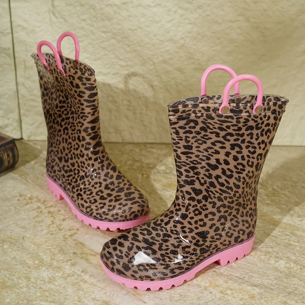 Bottes de pluie femme en caoutchouc imprimé léopard avec poignées contrastées