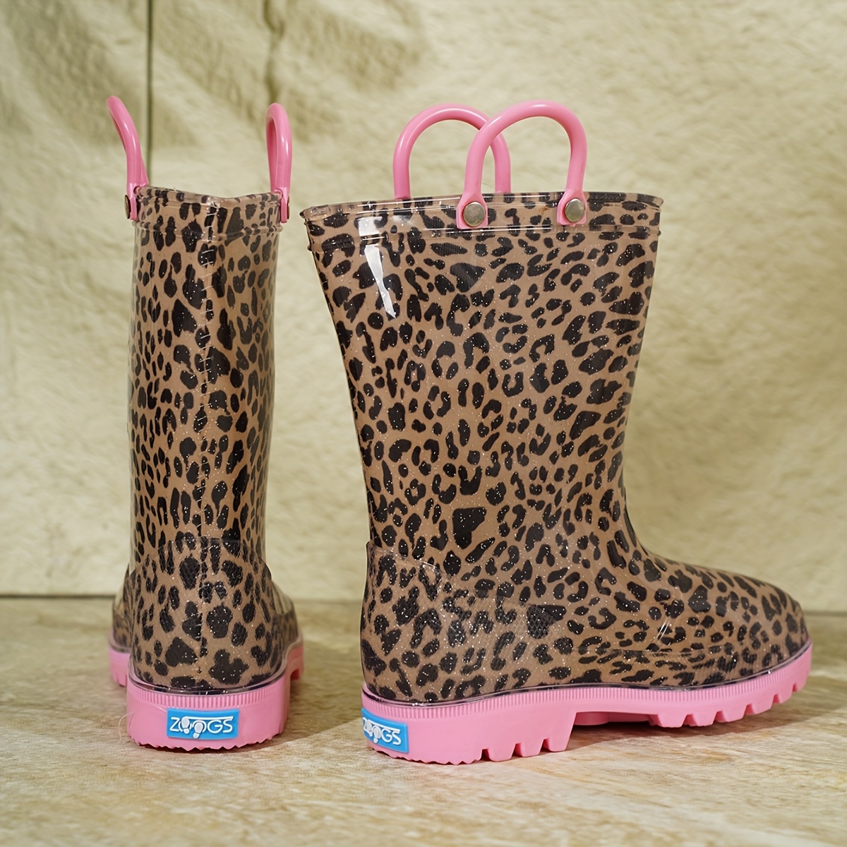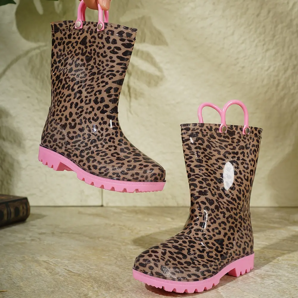 • Affirmez votre personnalité avec ces bottes de pluie femme chic à imprimé léopard tendance et poignées roses contrastantes.