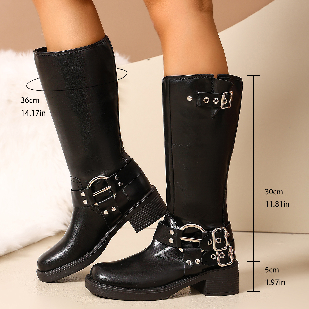 Bottes femme à talon épais – design mi-mollet avec boucles décoratives pull-on