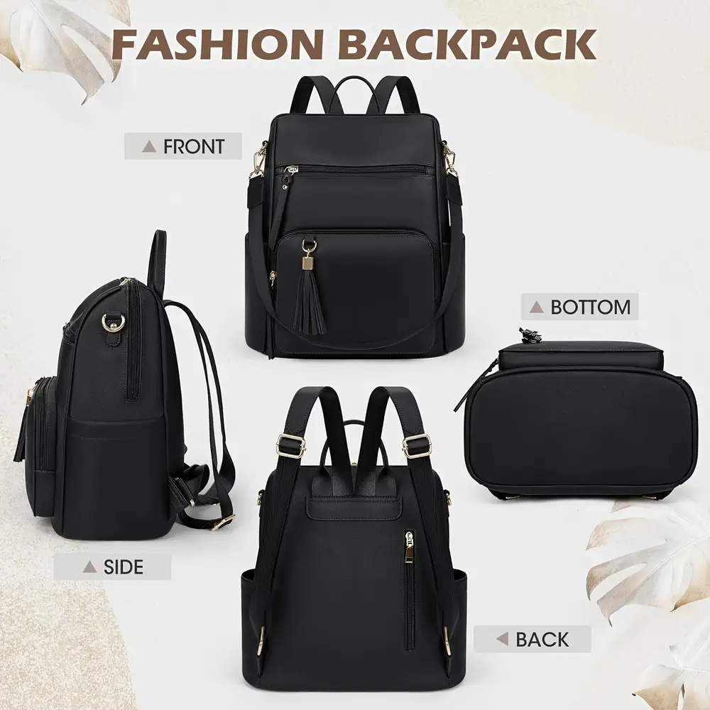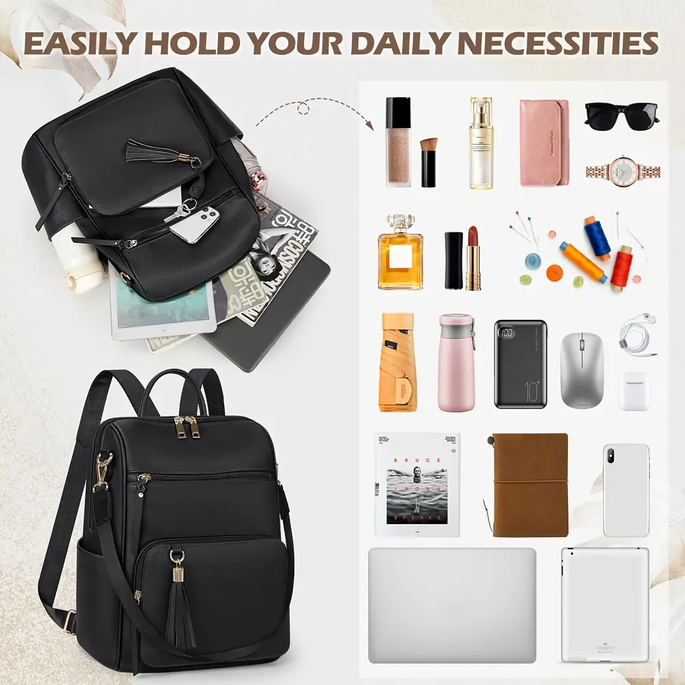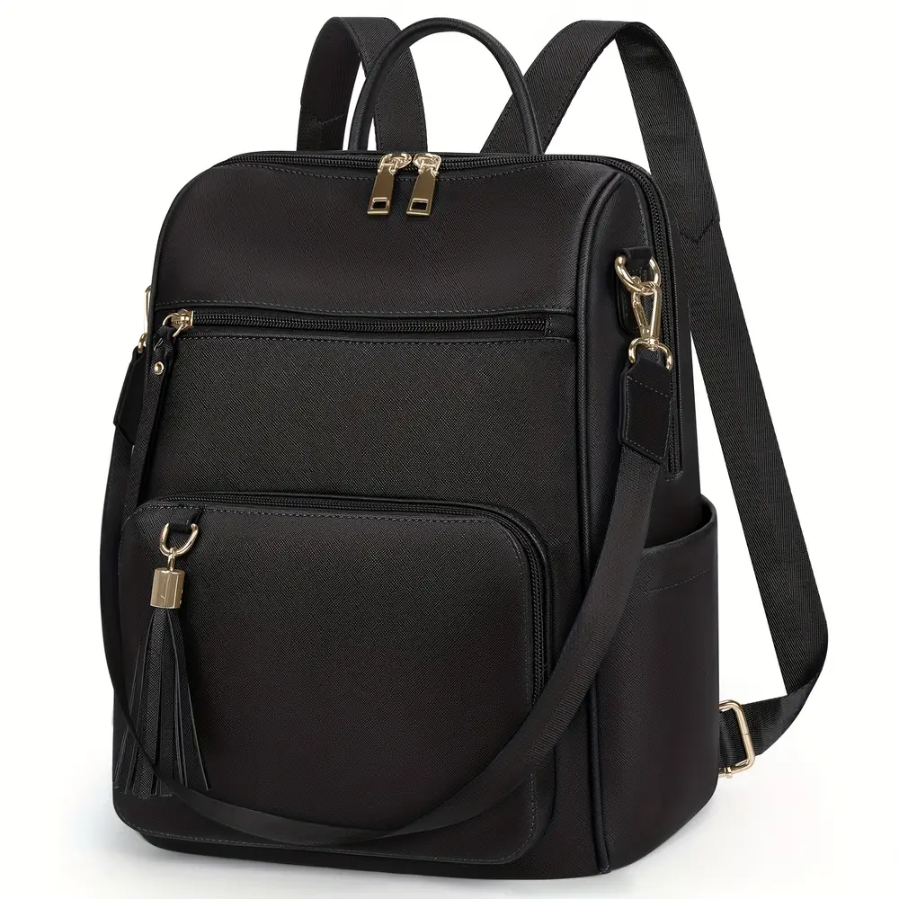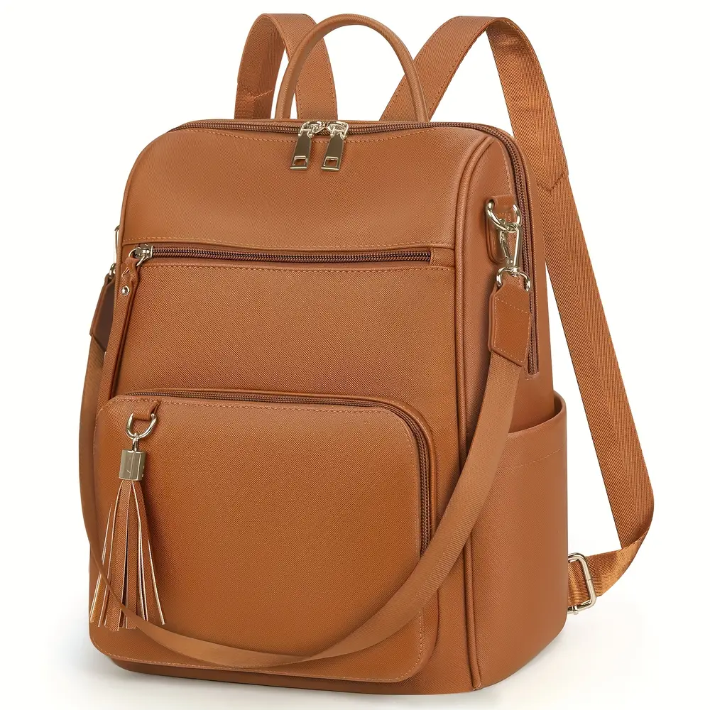 Sac à dos femme élégant en cuir synthétique avec compartiment ordinateur et pompon